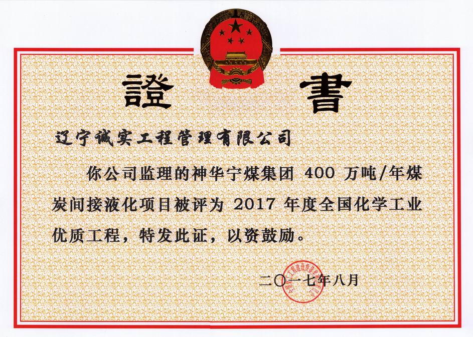2017年全國化學工業優質工程(神華寧煤集團400萬噸/年煤炭間接液化項目)