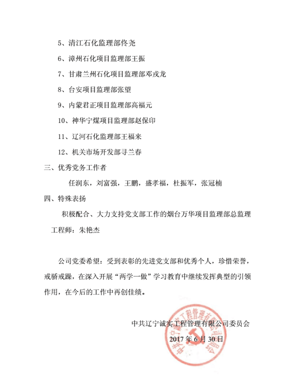 為慶祝中國共產(chǎn)黨建黨96周年,公司黨委于2017年6月30日下午在公司一樓會(huì)議室召開了慶祝建黨96周年暨“一優(yōu)兩先”表彰視頻大會(huì)。公司機(jī)關(guān)、撫順各項(xiàng)目監(jiān)理部及在撫的黨員同志在主會(huì)場(chǎng)參加了大會(huì),中海油惠州項(xiàng)目監(jiān)理部黨支部、甘肅華亭項(xiàng)目監(jiān)理部黨支部、寧夏石化項(xiàng)目監(jiān)理部黨支部、中化泉州項(xiàng)目監(jiān)理部黨支部、廣西石化項(xiàng)目監(jiān)理部黨支部、蘭州石化項(xiàng)目監(jiān)理部黨支部、內(nèi)蒙古君正項(xiàng)目監(jiān)理部黨支部、神華寧煤項(xiàng)目監(jiān)理部黨支部、煙臺(tái)萬華項(xiàng)目監(jiān)理部黨支部設(shè)立視頻分會(huì)場(chǎng)。黨委委員馬駿主持了視頻大會(huì)。首先,公司黨委副書記馮玉琢同志宣讀了“一優(yōu)兩先”表彰決定。接著,黨委書記孫學(xué)良結(jié)合公司實(shí)際做了慶祝建黨96周年的講話。最后全體黨員重溫的入黨誓詞,進(jìn)行入黨宣誓。