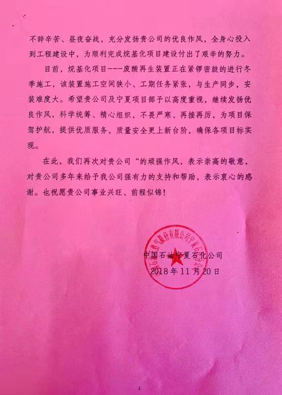 2018年11月20日,我公司收到了一封來自業(yè)主——中國(guó)石油天然氣股份有限公司寧夏石化分公司的感謝信。