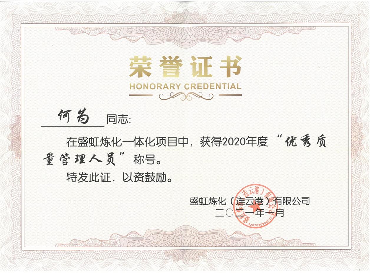 熱烈祝賀何為同志榮獲盛虹煉化一體化項目2020年度“優質質量管理人員”榮譽稱號