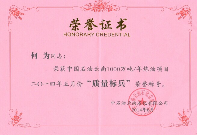表彰:云南項目部何為同志榮獲中國石油云南1000萬噸/年煉油項目2014年5月份“質量標兵“榮譽稱號